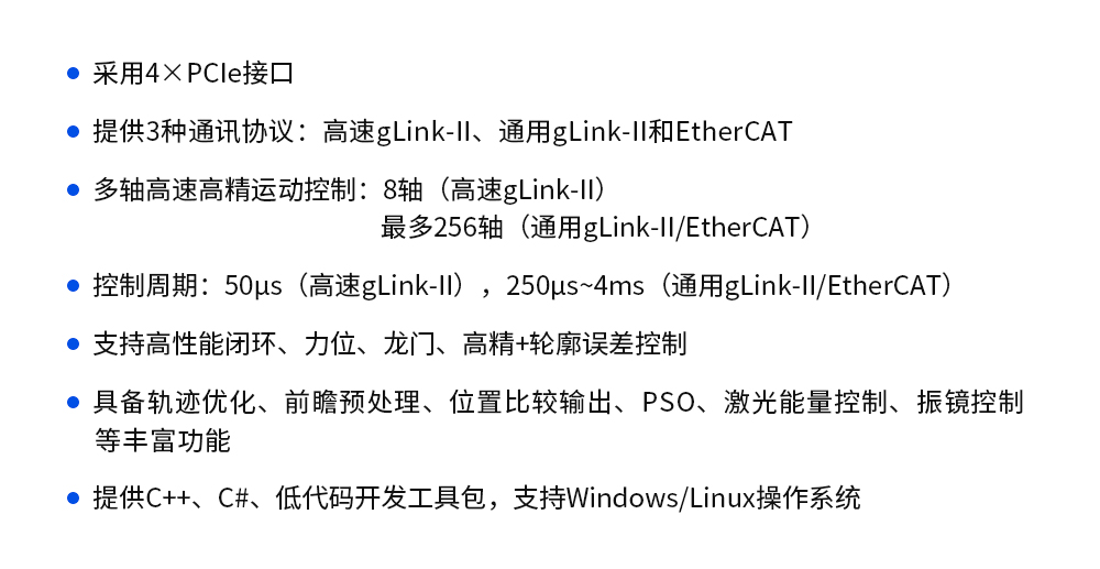 GVN系列插卡式運(yùn)動(dòng)控制器是一款高性能網(wǎng)絡(luò)型運(yùn)動(dòng)控制產(chǎn)品,適用于半導(dǎo)體、激光加工等有高速、高精需求的行業(yè)或有多軸運(yùn)動(dòng)控制需求的自動(dòng)化設(shè)備和自動(dòng)化流水線。產(chǎn)品采用高性能多核處理器,可以實(shí)現(xiàn)高速的運(yùn)動(dòng)控制。GVN支持高速gLink-II、通用gLink-II和EtherCAT三種通訊協(xié)議。高速gLink-II可以實(shí)現(xiàn)8軸高性能閉環(huán)控制,控制周期可達(dá)50微秒,內(nèi)置位置環(huán)、速度環(huán)和各種前饋及濾波算法,搭配GSHD高性能伺服驅(qū)動(dòng)器使用,可對(duì)電機(jī)進(jìn)行精準(zhǔn)高速控制,適用于半導(dǎo)體、激光加工等行業(yè)。通用gLink-II和EtherCAT能夠提供多達(dá)256軸的運(yùn)動(dòng)控制,具有位置比較輸出、PSO、激光能量控制、激光振鏡控制等豐富功能,可搭配GSHD高性能伺服驅(qū)動(dòng)器、GNM軸模塊和GTM模塊使用,同時(shí)兼容標(biāo)準(zhǔn)EtherCAT外設(shè),適用于多種類型的自動(dòng)化設(shè)備和自動(dòng)化流水線。