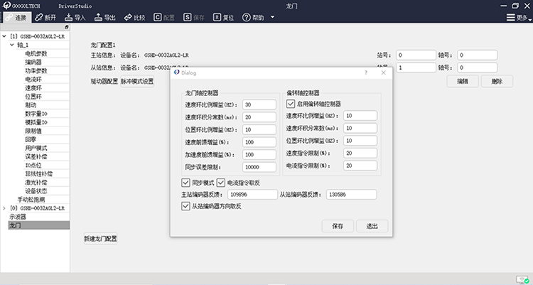 GSHD驅(qū)動器龍門控制部分?jǐn)U展了對脈沖控制方案的支持,龍門同步周期可達(dá)31.25us。使用脈沖方案控制的龍門雙驅(qū)需要把主從軸驅(qū)動器用工業(yè)標(biāo)準(zhǔn)千兆網(wǎng)線連接起來,上位機(jī)只需控制龍門主軸的運(yùn)動,運(yùn)動控制架構(gòu)如下。配置龍門模式時(shí)需要手動修改驅(qū)動器站號,調(diào)試方法基本相同。值得注意的是,在進(jìn)行龍門軸負(fù)載慣量比辨識時(shí),龍門主從軸需要同時(shí)設(shè)置相同慣量比。【慣量比=(辨識出來的質(zhì)量-2*電機(jī)質(zhì)量)/(2*電機(jī)質(zhì)量),僅用于龍門慣量比計(jì)算】