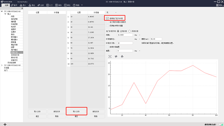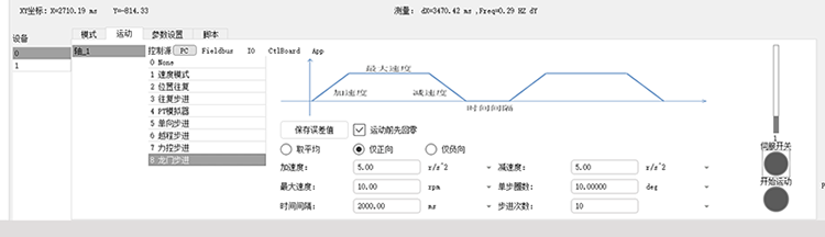 在調(diào)試軟件中提供的龍門步進(jìn)模式下,按照實(shí)際控制需求設(shè)置好參數(shù)之后,驅(qū)動器會往復(fù)運(yùn)行并且記錄編碼器位置數(shù)據(jù),導(dǎo)出誤差補(bǔ)償表格后,即可啟用龍門應(yīng)力補(bǔ)償。