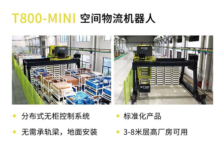 在本次新品發(fā)布會上,金石機(jī)器人展示了與固高科技合作定制開發(fā)的,針對托盤類、貨框類貨物的空中分揀物流應(yīng)用場景里的空間物流機(jī)器人、裝車機(jī)器人和伺服堆垛機(jī)。
