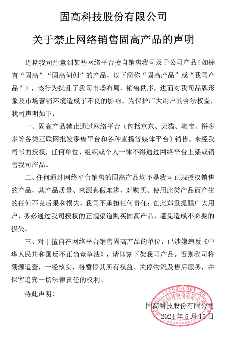 嚴(yán)正聲明|固高科技禁止網(wǎng)絡(luò)銷售的聲明